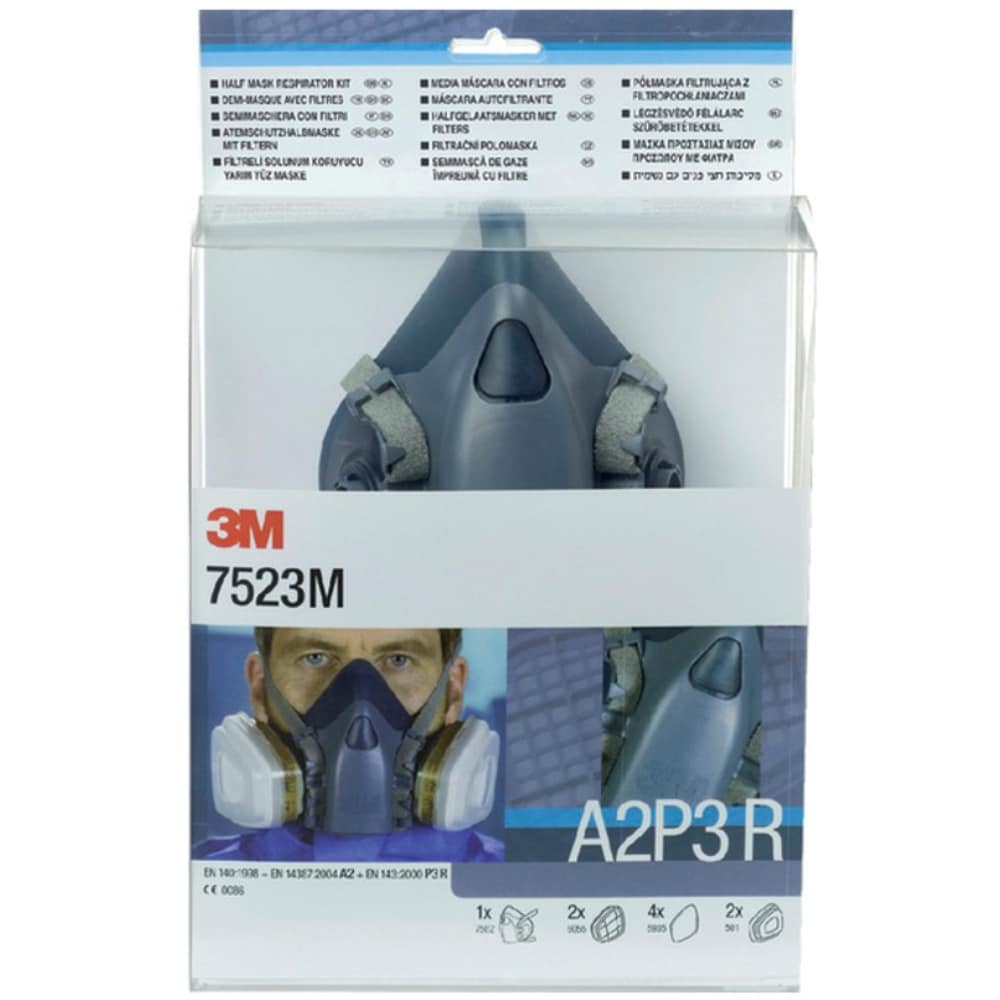 Polobrazna maska 3M 7523M komplet A2P3 nudi zaščito proti plinom in hlapom, je iz hipoalergenega silikona in udobna za nošenje. Komplet je sestavljen iz polobrazne maske 3M 7503 (velikosti M) ter kompleta zamenljivih filtrov. Ta koži prijazna maska ima t.i. “Drop down” naglavni pas, ki omogoča, da med kratkimi odmori maske ni potrebno odložiti, ampak lahko ostane okoli vratu. Patentirani “Cool Flow” ventil za izdih omogoča lahko izdihovanje, trajnost in se zlahka čisti. Polobrazna maska 3M 7523M A2P3 ima bajonetni sistem za pritrjevanje filtrov, ki ponuja možnost uporabe široke palete dvojnih lahkih filtrov za zaščito pred plini, hlapi in delci.
