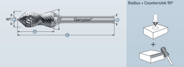 Roto rezkar Garryson RADIUS LINE – stožčasta glava, 90° – z dvojnim nasekom glave in enojnim nasekom v predelu radija – izdelan iz karbidne trdine, namenjen za posnemanje robov in obdelavo spojev in izvrtin.